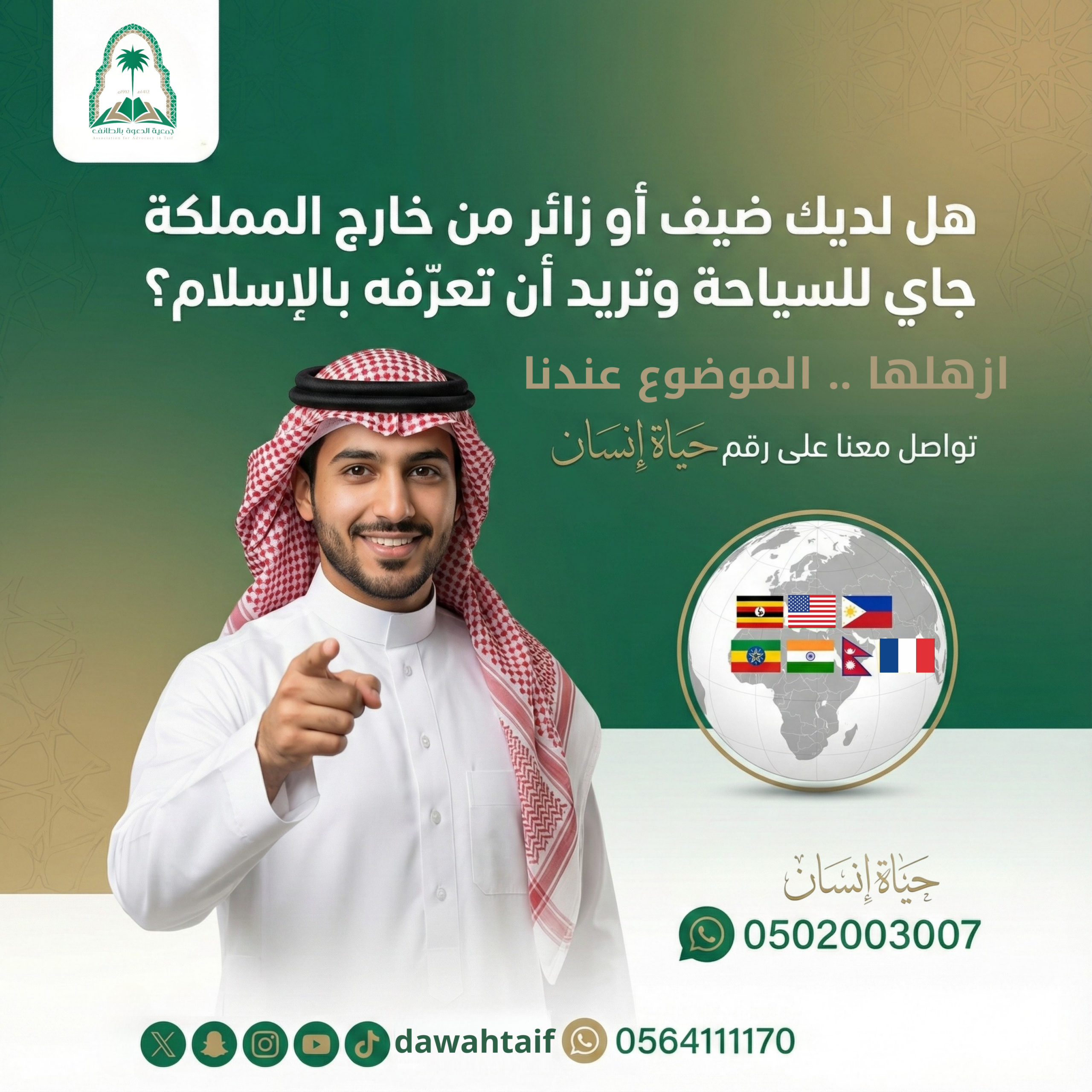 ضمن رسالتها في التعريف بالإسلام، تقدم جمعية الدعوة بالطائف برنامج “حياة إنسان”، المخصص للسياح والزوار من خارج المملكة العربية
