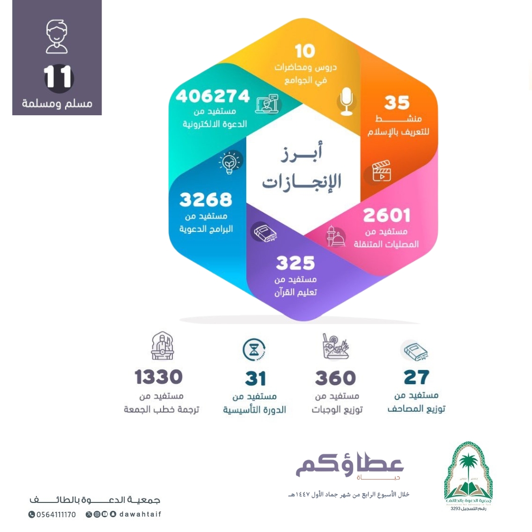 أعلنت جمعية الدعوة بالطائف عن أبرز إنجازاتها خلال الأسبوع الرابع من شهر جمادى الأولى لعام 1447هـ، والتي شملت عدداً من المبادرات المتنوعة داخل مدينة الطائف، وجاءت هذه الجهود امتدادا لدور الجمعية في خدمة المجتمع .
